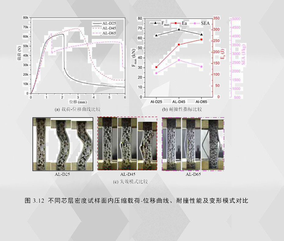 為了分析泡沫芯層密度的影響,選取芯層密度為0.25g/cm3,0.45g/cm3和0.65g/cm3的鋁合金夾層結(jié)構(gòu)作為研究對象。圖3.12(a)和(c)為三種試件的載荷-位移曲線和變形過程的比較,從圖中可以看出,其載荷-位移曲線的相似性相較大。其中AL-D25和AL-D45在第一二階段的變化趨勢基本一致,區(qū)別在于前者出現(xiàn)整體屈曲,并且芯層剪切破壞明顯,載荷出現(xiàn)斷崖式下降;而后者的失效模式以面板屈曲為主,芯層并未出現(xiàn)明顯芯層破裂,所以試件整體的仍具備相對穩(wěn)定的承載能力,雖說載荷也出現(xiàn)大幅度下降,但其下降的坡度遠(yuǎn)沒有前者陡。對試件AL-D65而言,其載荷-位移曲線與其他兩個試件的主要差別在于第一階段和第二階段交界處附近載荷出現(xiàn)斷崖式下降,造成這種現(xiàn)象的原因是某一面板出現(xiàn)較大尺寸的屈曲,并伴隨著大面積膠層失效,此面板基本喪失了大部分承載能力,從而導(dǎo)致載荷劇減,而當(dāng)另一面板再次出現(xiàn)屈曲時,載荷仍然出現(xiàn)斷崖式下降。雖然試件AL-D45也出現(xiàn)了面板屈曲現(xiàn)象,但與AL-D65不同的是,前者的兩面板幾乎同時出現(xiàn)屈曲失效,兩面板的承載能力不至于瞬間減低,雖說承載能力有所下降,但也并未出現(xiàn)斷崖式下跌,而且AL-D45的峰值載荷對應(yīng)的位移大約在3mm,比AL-D65的1.3mm更遲,這也從另一方面解釋了前者具有更大的峰值載荷。有趣的是,雖然三者曲線相差較大,但三種試件在第一階段和第二階段的斜率是旗鼓相當(dāng)?shù)摹?/span>