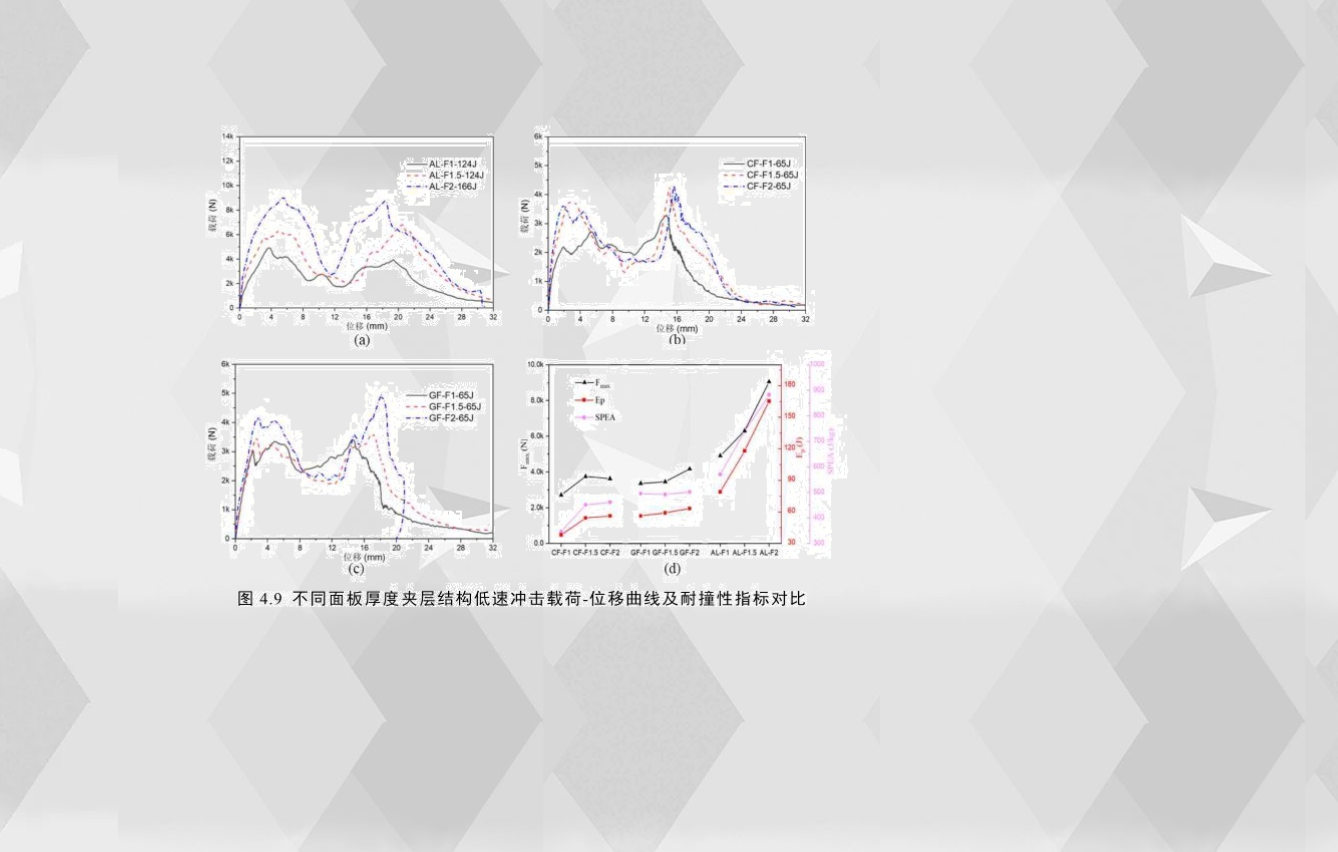 為了研究夾層結構的面板厚度對沖擊性能的影響,圖4.9(a)-(c)比較了三種不同面板厚度的夾層結構的載荷-位移曲線。無論是彈塑性面板還是脆性面板,夾層結構的面板厚度對其低速沖擊響應均有較大影響。為了更直觀地比較,圖4.9(d)對比了不同面板厚度夾層結構的耐撞性指標,通過觀察,鋁合金夾層結構的耐撞性能隨面板厚度增加而明顯增加,面板厚度從1mm增加到2mm,其初始峰值載荷、穿透吸能和比穿透吸能分別提高了84%、108%和54%;對玻璃纖維夾層結構而言,當面板厚度從1mm增加到2mm,其初始峰值載荷和穿透吸能分別只提高了24%和13%,而面板厚度的增加對比穿透吸能的影響效果差異不大;而對碳纖維夾層結構而言,當面板厚度從1mm增加到2mm,其穿透吸能和比穿透能分別提高了42%和33%,并且隨著層數的增加,耐撞性指標增加的幅度大幅減小。